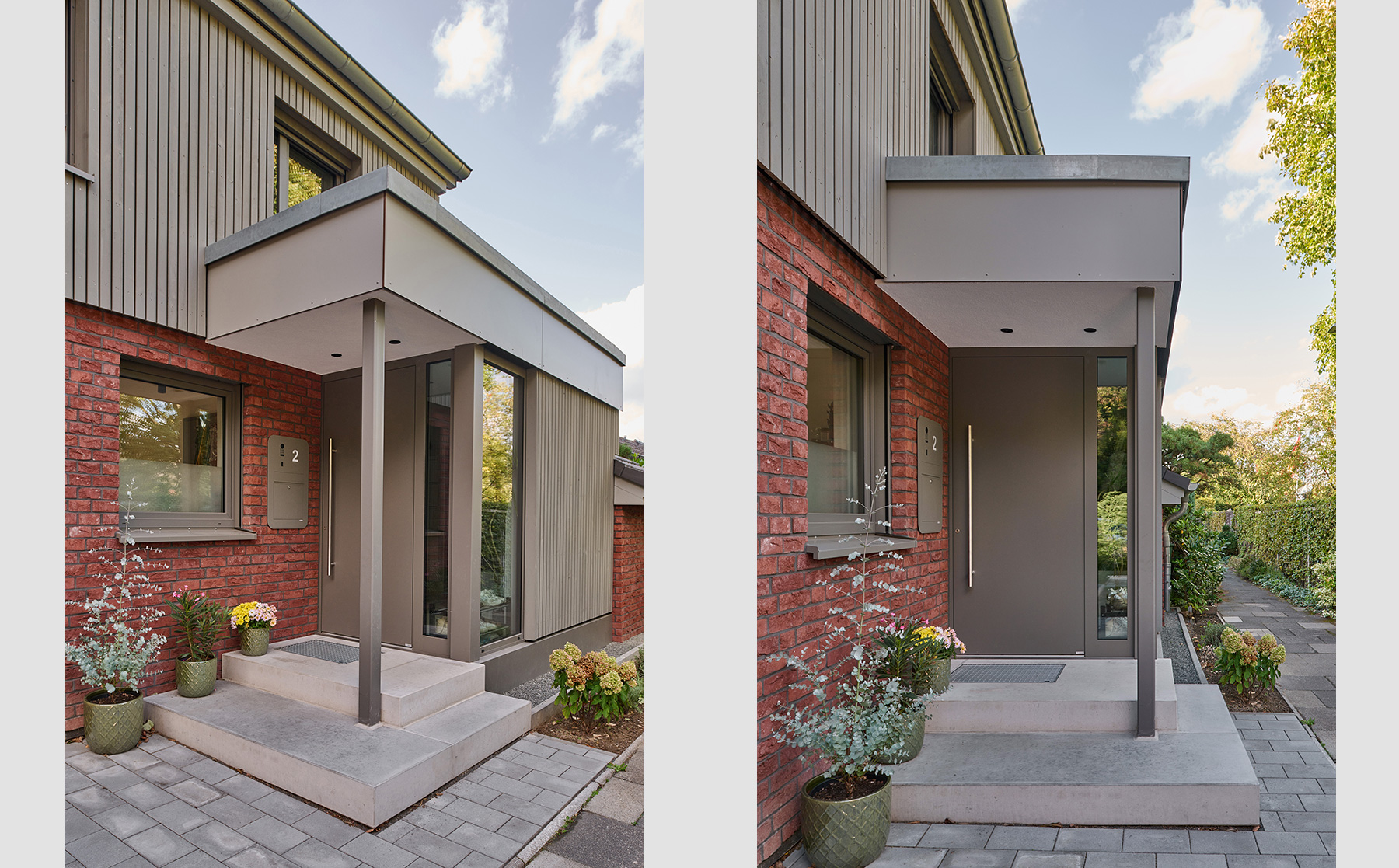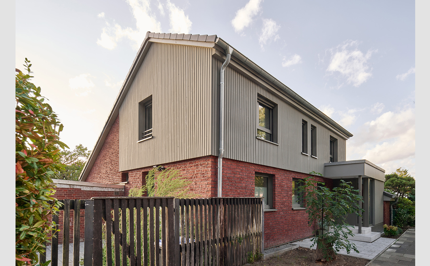 Die energetische Sanierung erfolgte durch eine Kombination aus Außen- und Innendämmung. Die neuen Fenster und Türen sowie die vertikale Holzlattung sind in Lichtgrau gehalten und sorgen für ein zeitgemäßes, aber zurückhaltendes Erscheinungsbild. Die gewählten Klinkerriemchen greifen die Farbigkeit des Bestandsklinkers auf und fügen sich harmonisch in die umgebende Bebauung ein.