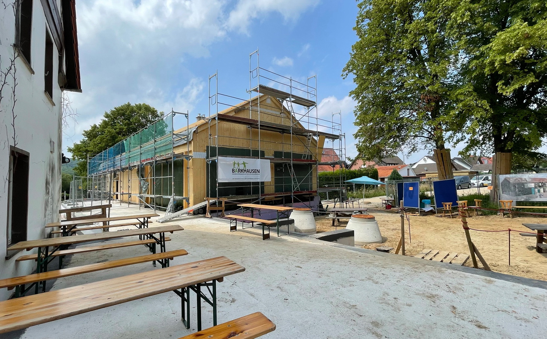 Etappe geschafft: Im Schullandheim Barkhausen sind die Holzkonstruktionen des Akademiegebäudes und des Gästehauses fertiggestellt. Dies wurden beim Richtfest am 22. Juli auf dem Außengelände mit den Beteiligten gefeiert. Nun setzen sich die Arbeiten mit dem weiteren Ausbau der beiden Gebäude fort.