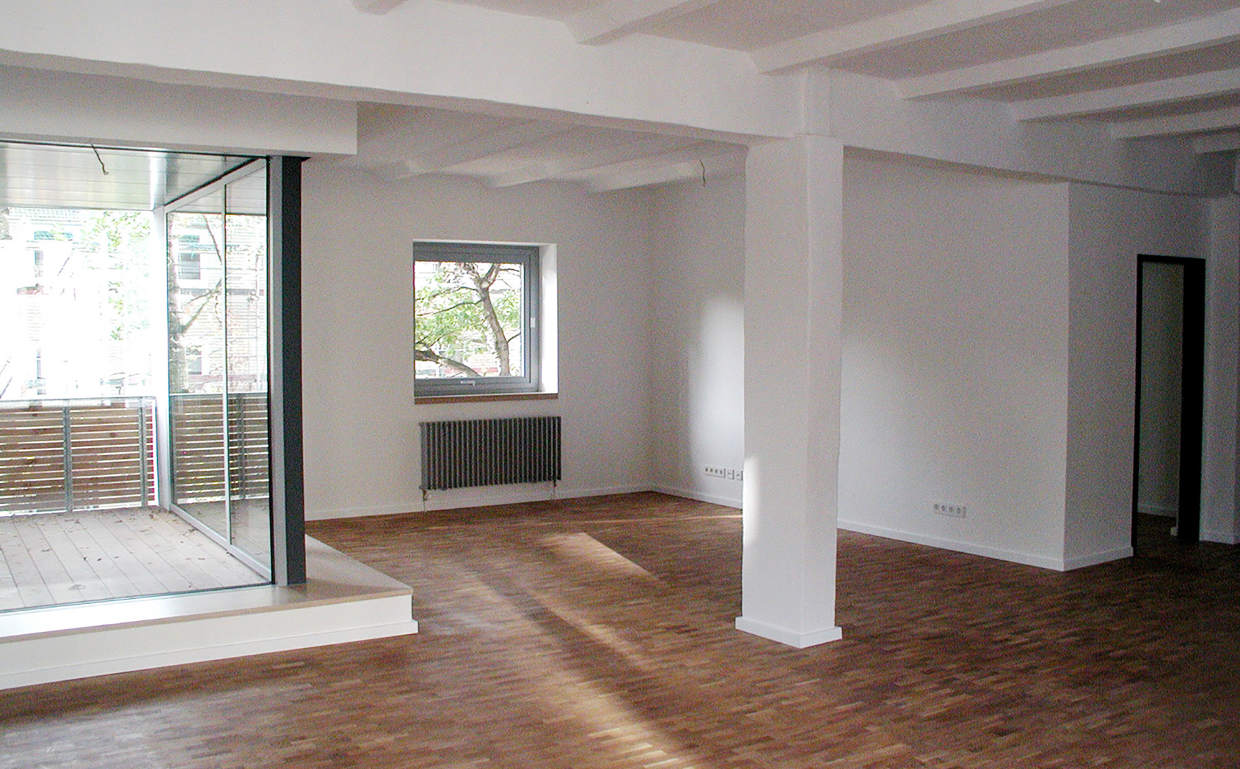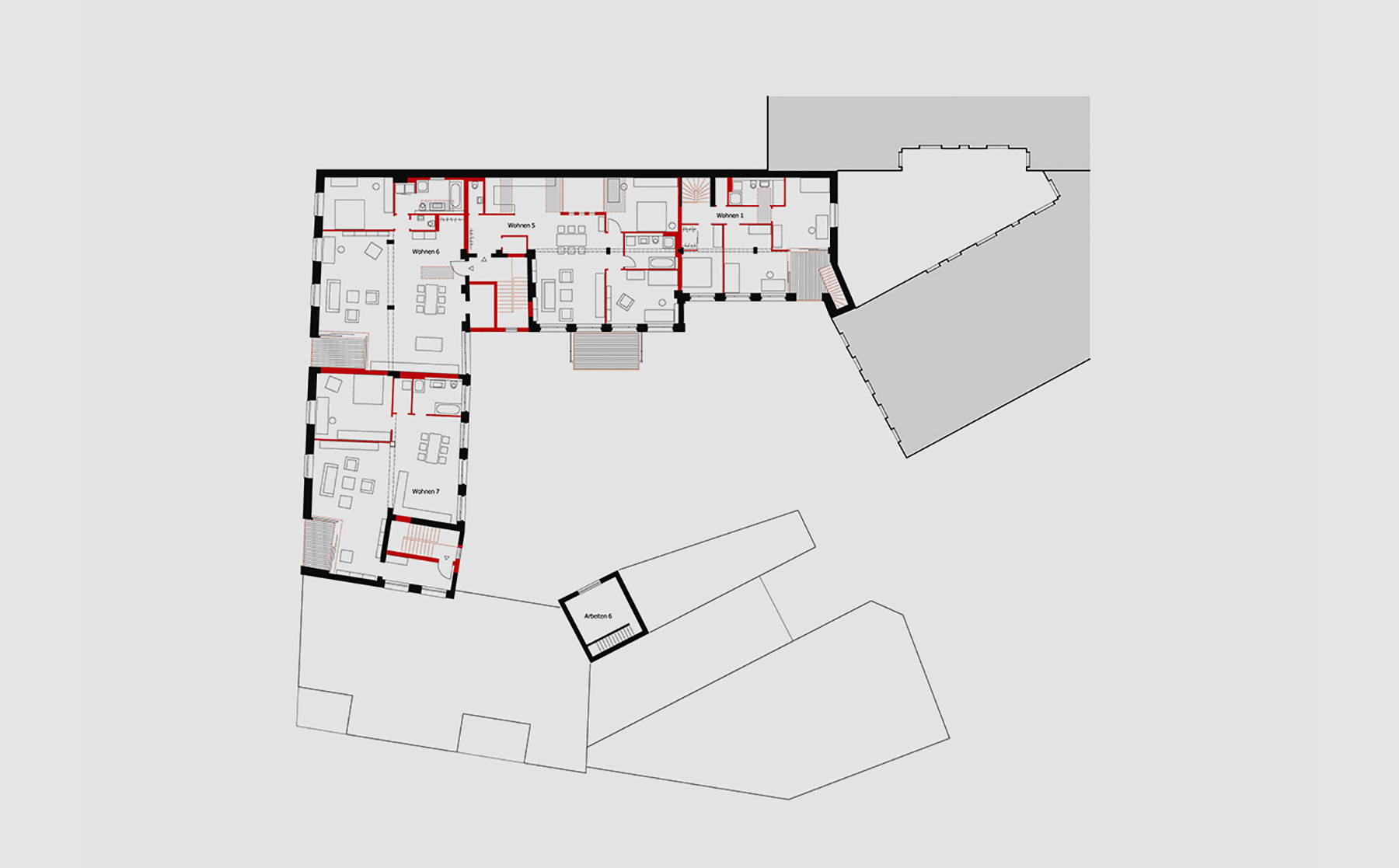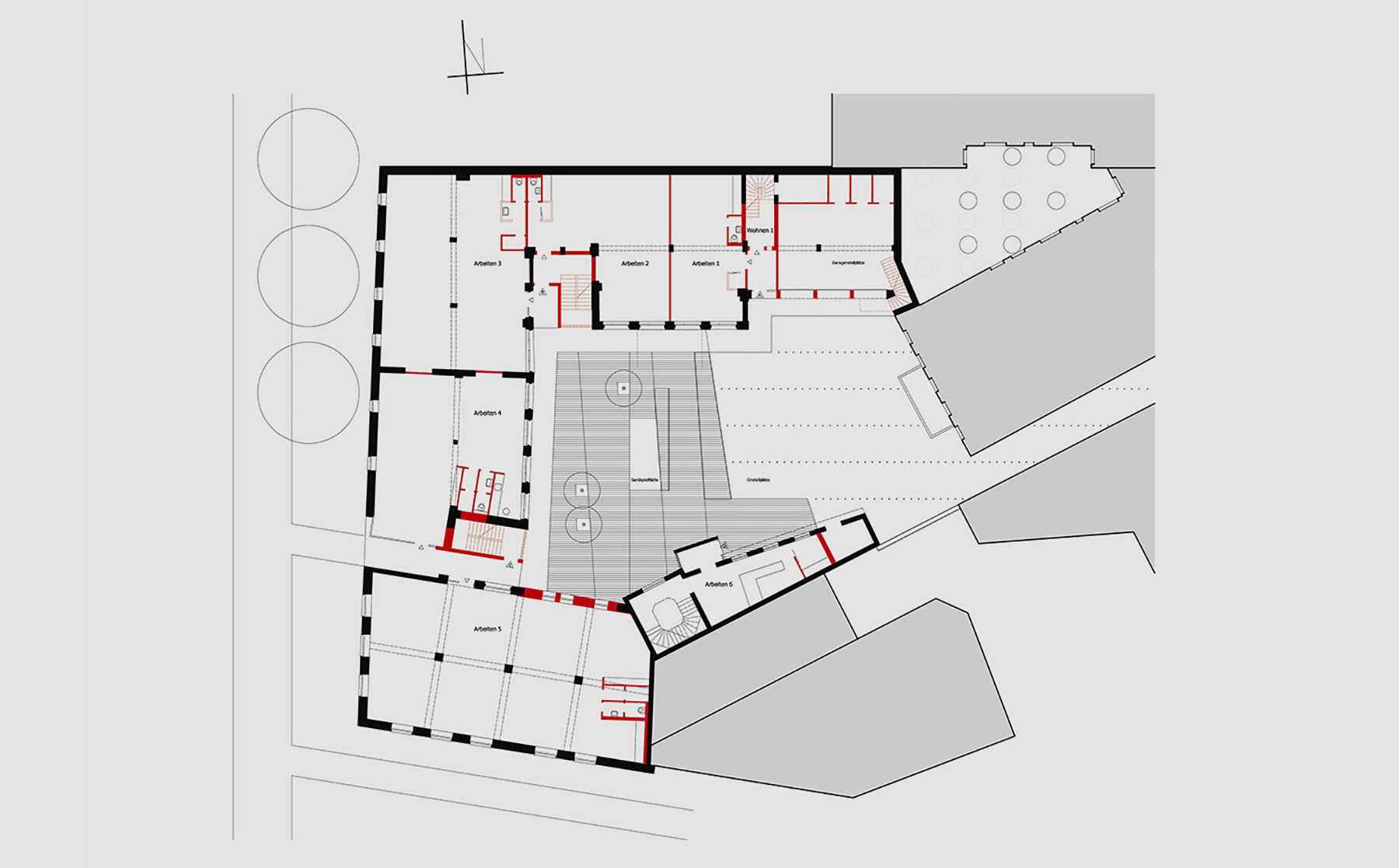Die vorhandene Gebäudestruktur mit insgesamt 1.670 m² Haupt- und 570 m² Nebennutzfläche ermöglichte flexible Grundrisseinteilungen in zwölf Einheiten von 50 bis 450 m². Entstanden sind zwei Ateliers und drei Büros im Erd- und ersten Obergeschoss sowie sieben Loftwohnungen im 1. und 2. OG (zwischen 115 und 150 m²).