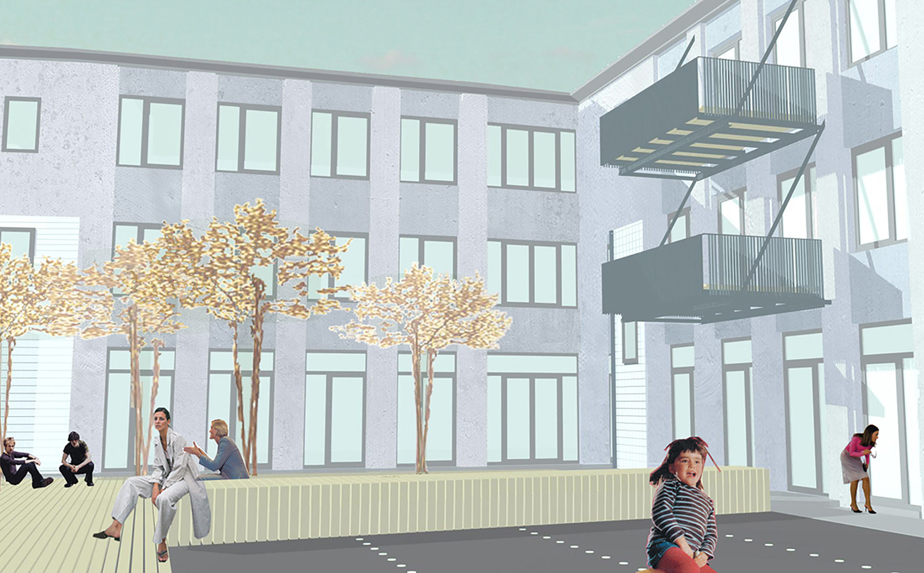 Alle Wohnungen bestehen aus einem durchgehenden Wohnbereich mit offener Küche und ein bis drei Schlafzimmern, sind zweiseitig belichtet und haben südseitig vor die Fassade gestellte Balkone oder westseitig eingeschnittene Loggien.