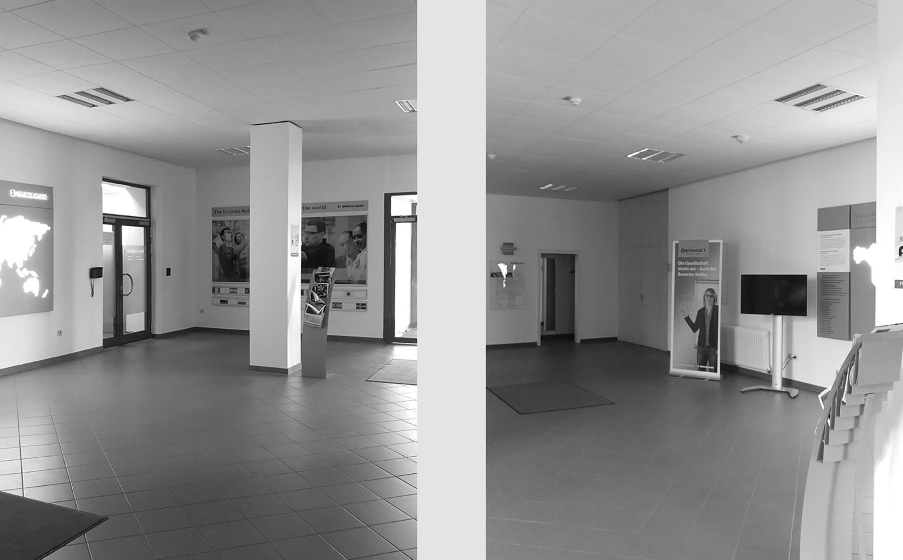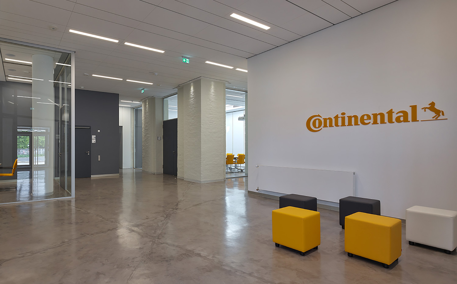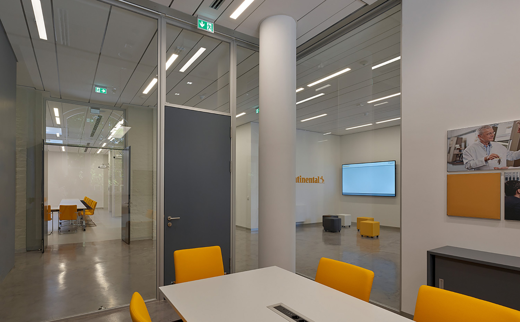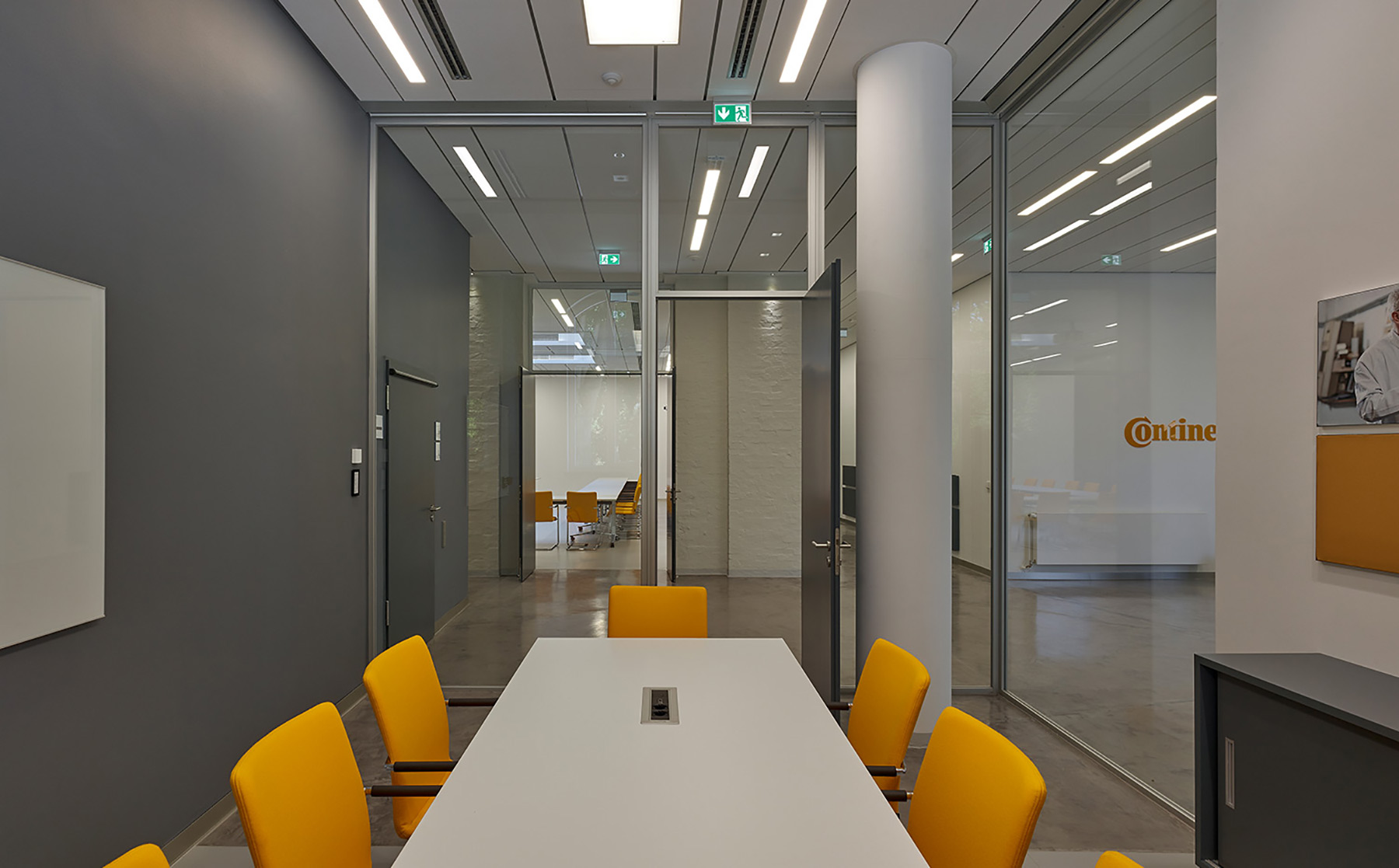 Die eisengrauen, glatten Holztürelemente nehmen Bezug zur vorhandenen Farbgebung im Gebäude und unterstreichen die kühl-sachliche Anmutung. Der mittelgrau gefasste Körper der – ebenfalls umgebauten – WC-Anlage wiederum schafft als dunkler Hintergrund eine angenehme Aufenthaltsqualität in Foyer und Meeting-Raum; die melonengelbe Farbigkeit der Möblierungselemente greift die CI-Farbe der Konzernmutter Continental auf und setzt wichtige Farbakzente.