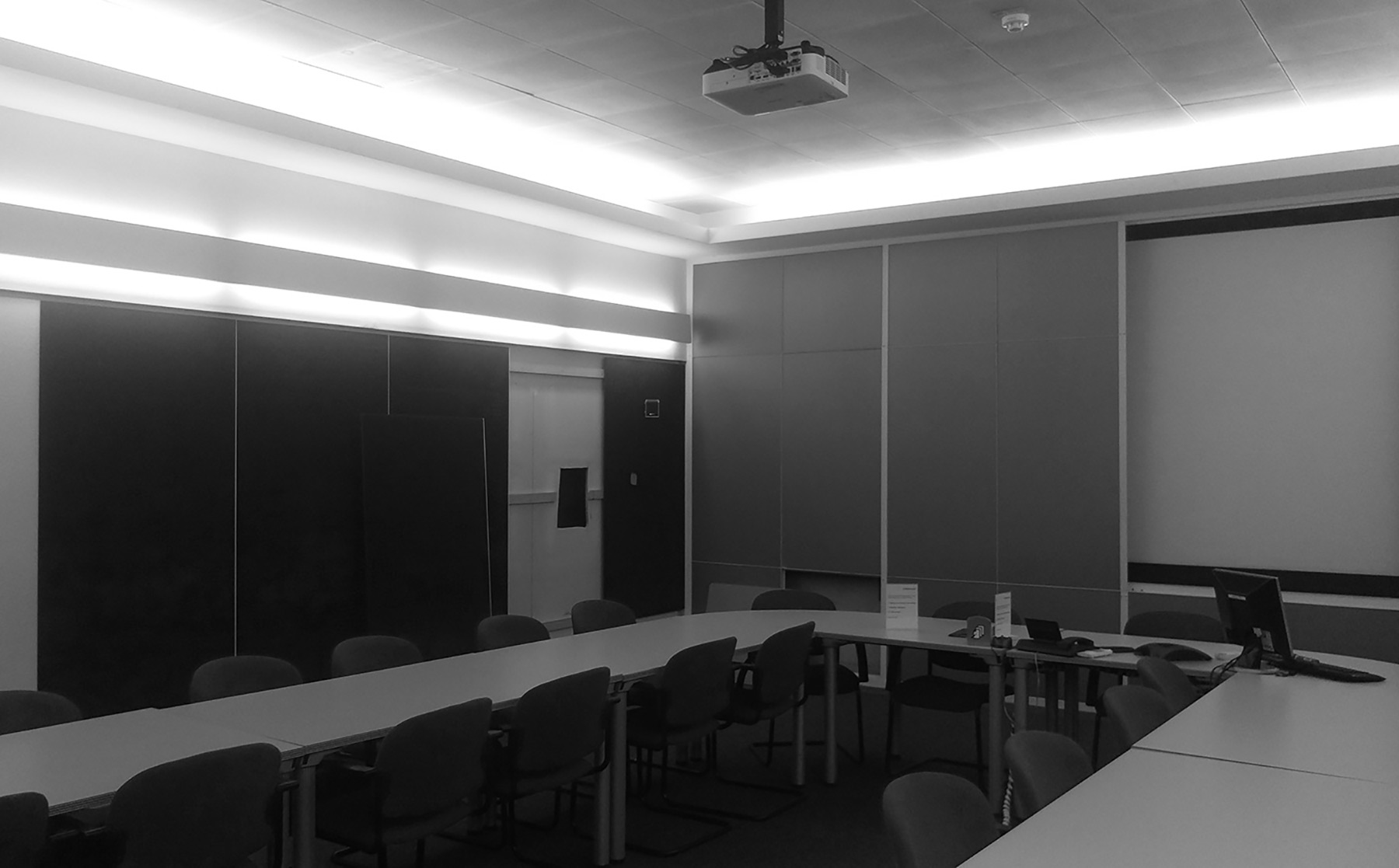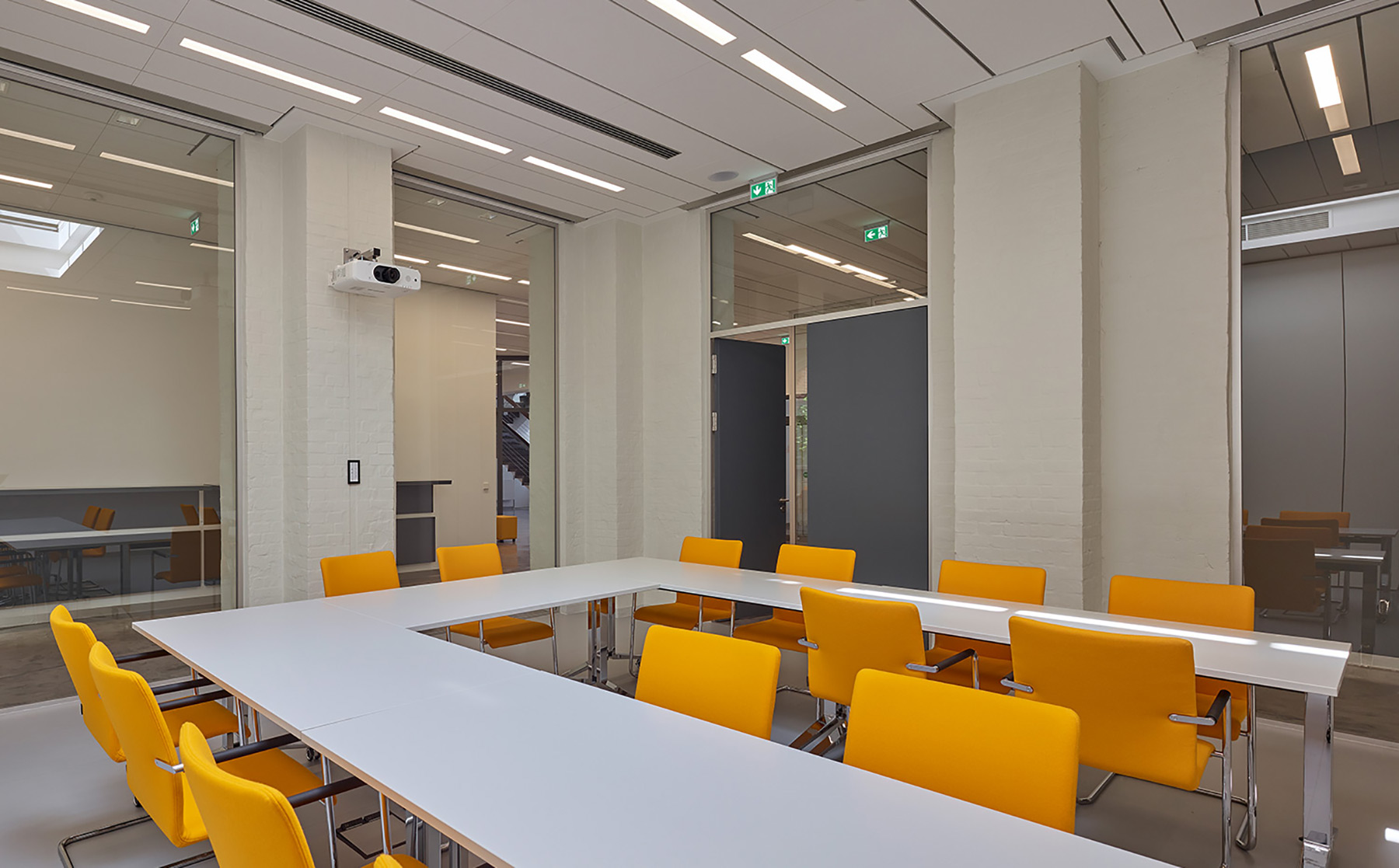 Durch klapp- und stapelbare Möblierung lässt sich die Zuschneiderei flexibel als Konferenz- und Besprechungsräume oder als Seminar- und Veranstaltungssaal nutzen, der je nach Bestuhlung bis zu ca. 50 Personen aufnehmen kann.