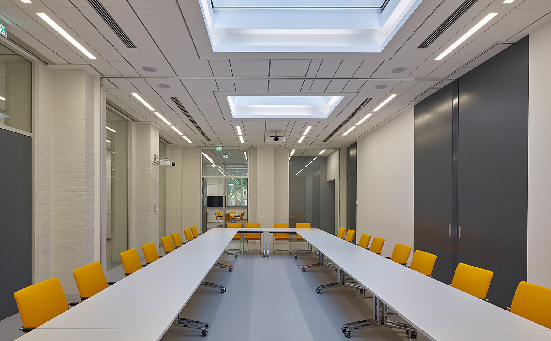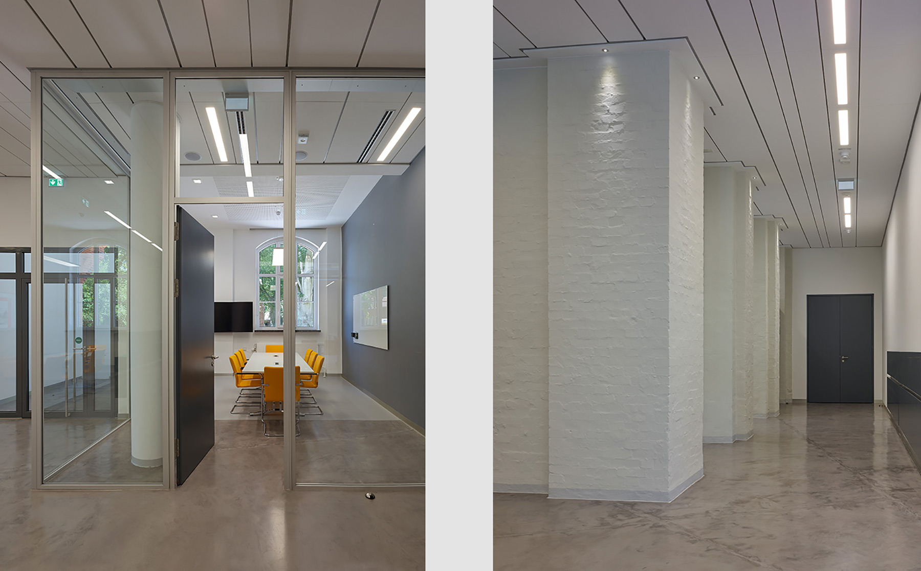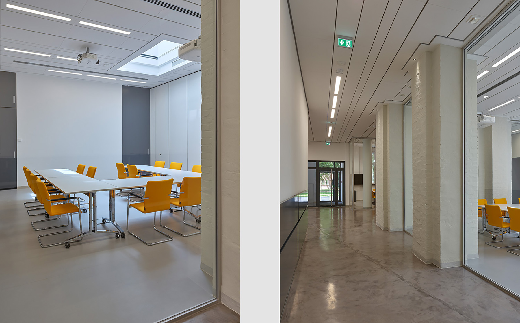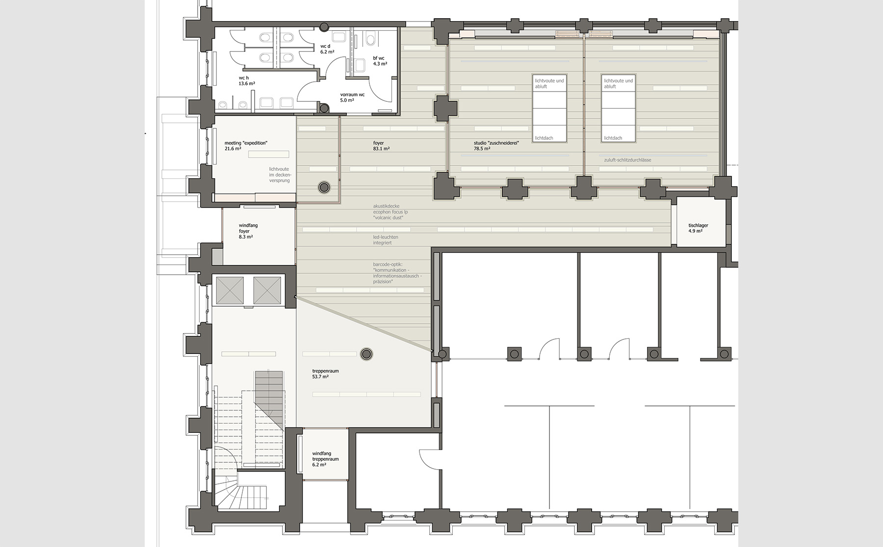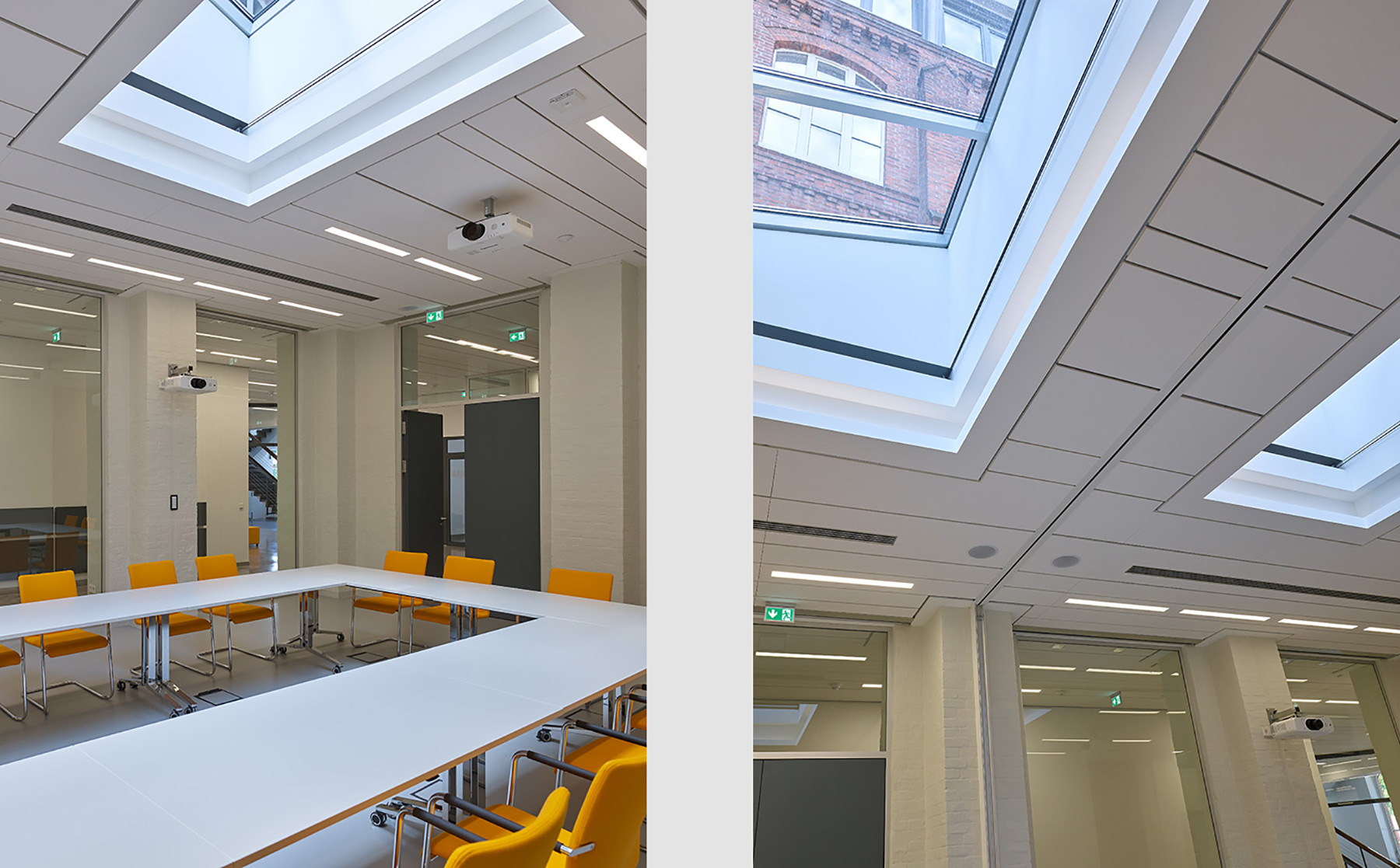 Die alte Zuschneiderei verfügte über drei Glasdächer, von denen noch eines in Originalform über dem abgetrennten Technikraum erhalten ist. Um den Konferenzbereich wieder natürlich belichten zu können, wurden nun in zwei Deckenfelder der bauzeitlichen Stahlträgerdecke zwei neue Lichtdächer eingeschnitten. Um Belichtung und Durchblick nicht zu beeinträchtigen, wurde auch die Expedition mit Glaswänden vom Foyer abgetrennt.