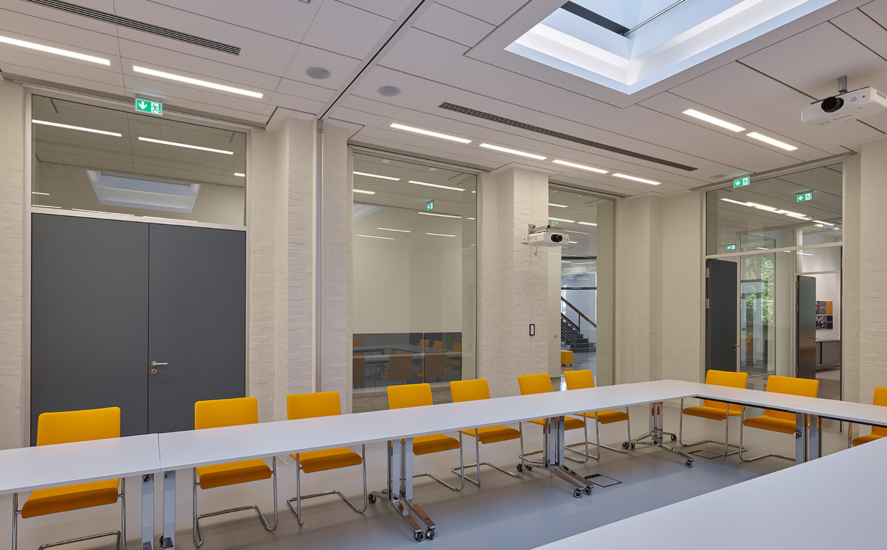 In der Mittelachse ist eine schallschutztechnisch wirksame, mobile Raumtrennwand platziert, die sich wandbündig parken lässt. Vorsatzschalen und Raumtrennwand wurden mit Magnettafelfunktion für Gruppenarbeiten ausgestattet.