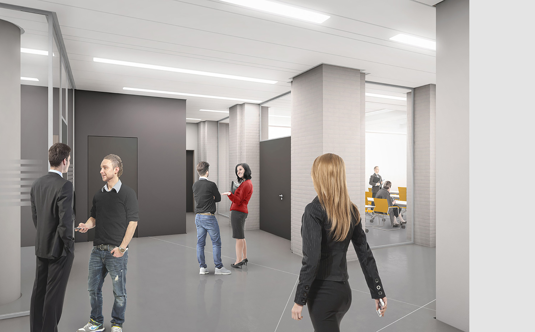 Unsere funktionale und gestalterische Grundidee bestand in der konsequenten Öffnung des Studios, einer Entkernung und Freilegung der bauzeitlichen Strukturen. Die Lisenen-Backsteinpfeiler wurden wieder sichtbar gemacht und stellen als geschlämmtes Mauerwerk den Bezug zur denkmalgeschützten Außenhülle des Gebäudes her. Durch Abbruch und Neuerrichtung von Trennwänden wurde die raumbildende Pfeileranordnung an zwei Seiten freigestellt und das Foyer L-förmig erweitert. Der Raumabschluss des Foyers erfolgte mit neuen, raumhohen Glaselementen in filigranen Profilen.