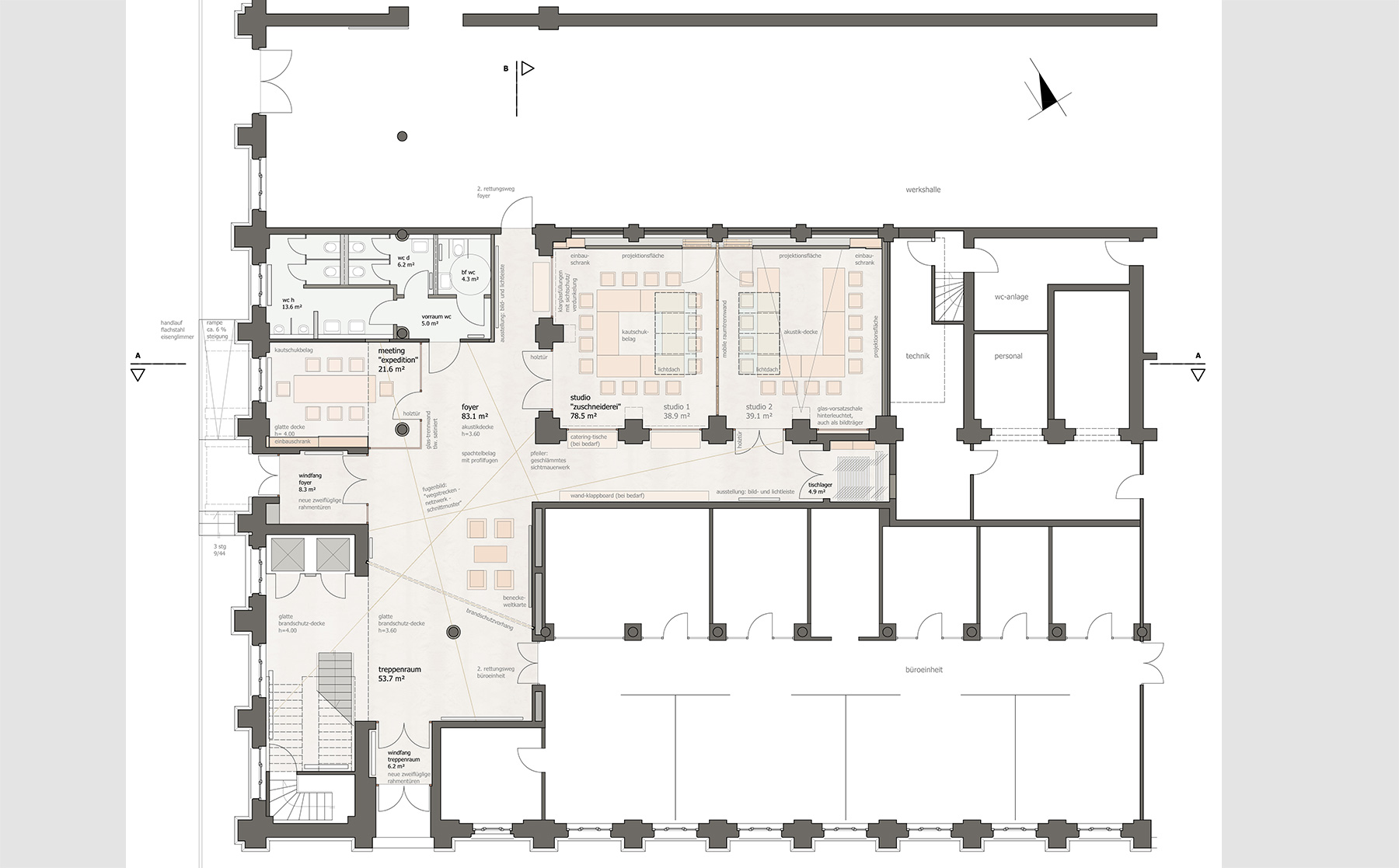 Durch den grundlegenden Umbau sollte ein zeitgemäßer, teilbarer und multifunktional nutzbarer Konferenzbereich entstehen, die heute wieder so genannte Zuschneiderei.