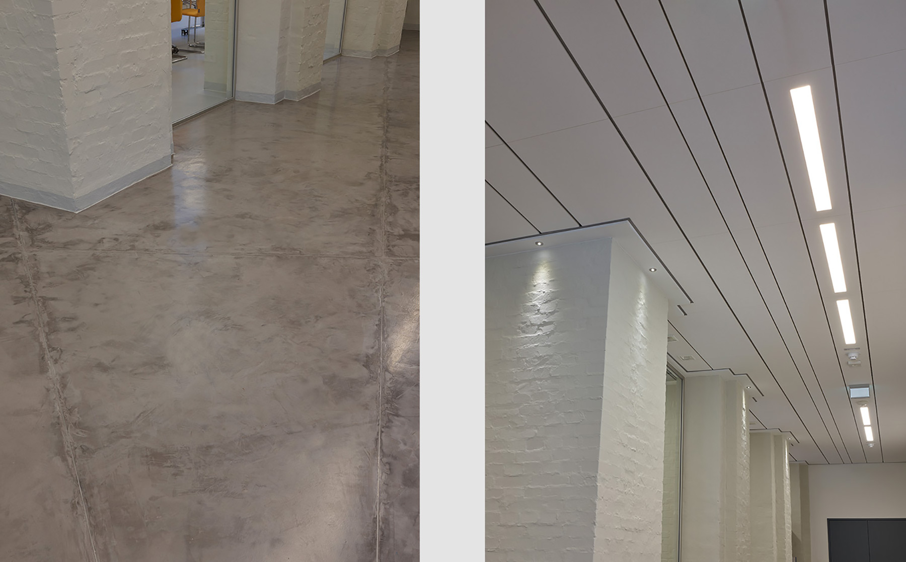 Die Meeting- und Konferenzbereiche sind mit einem hellgrauen, elastischen Kautschukbelag belegt.