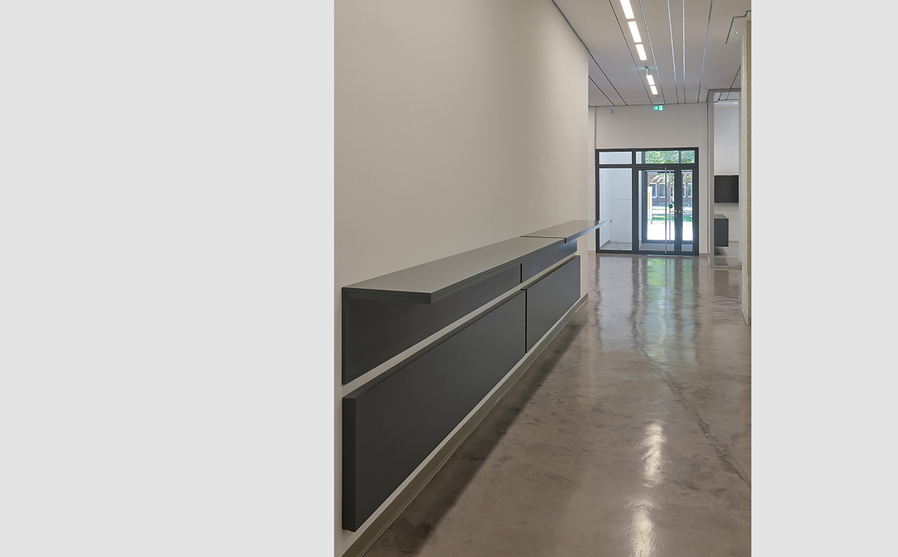 Die weiße Akustikdecke läuft hingegen wandparallel in einer Richtung und betont mit ihren unterschiedlich breiten, durchlaufenden Profilfugenabständen den räumlichen Zusammenhang zwischen Foyer, Zuschneiderei und Expedition. Lichtelemente und Lüftungs-Schlitzdurchlässe sind linear und bündig integriert, um eine ruhige Gesamtwirkung trotz rhythmisierter Plattenbreiten zu gewährleisten. Die Decke erinnert an ein Barcode-Muster, das hier für Kommunikation, Informationsaustausch und Präzision steht.