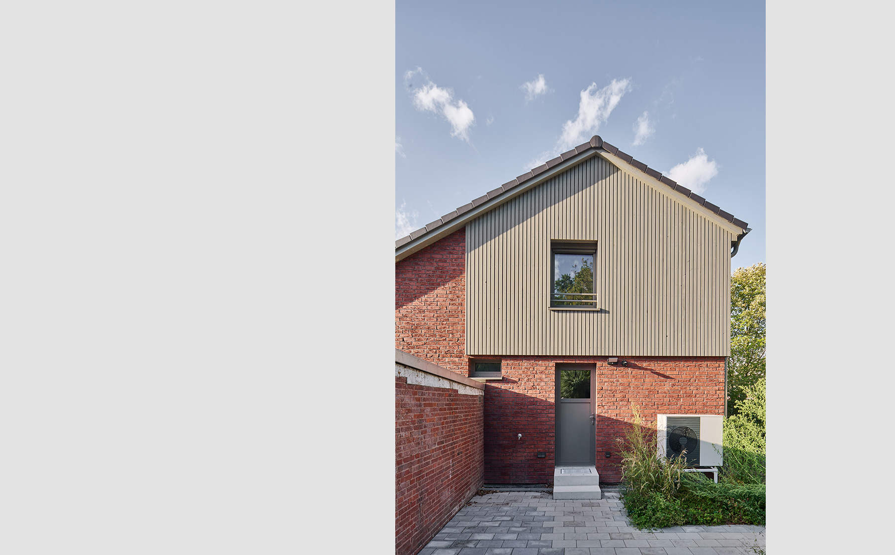 Die energetische Sanierung erfolgte durch eine Kombination aus Außen- und Innendämmung. Die neuen Fenster und Türen sowie die vertikale Holzlattung sind in Lichtgrau gehalten und sorgen für ein zeitgemäßes, aber zurückhaltendes Erscheinungsbild. Die gewählten Klinkerriemchen greifen die Farbigkeit des Bestandsklinkers auf und fügen sich harmonisch in die umgebende Bebauung ein.