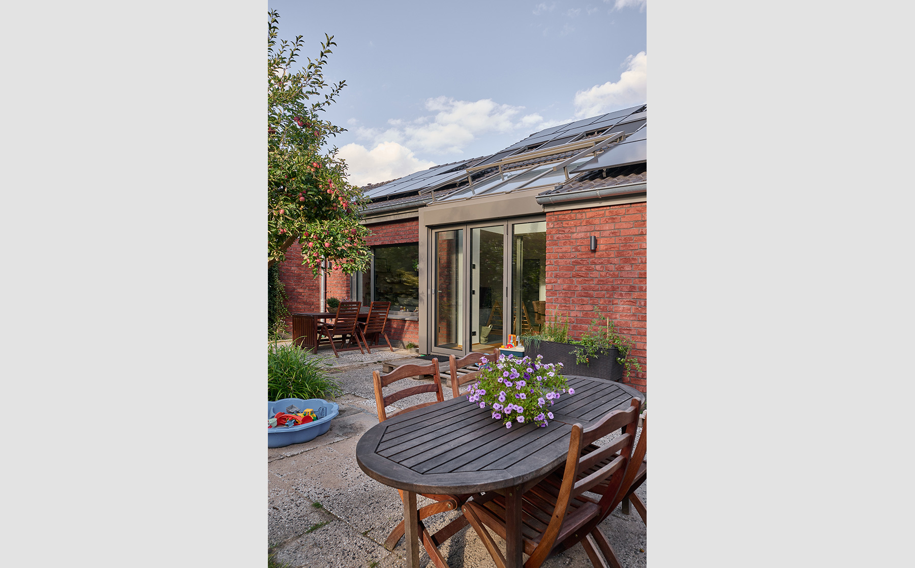 Eine neue Photovoltaikanlage auf dem Dach erzeugt Strom aus erneuerbaren Energien. Das vormals gemischte Heizsystem aus Kachelofen, Nachtspeicherheizungen und Gastherme wurde durch eine Luftwärmepumpe mit Flächenheizung ersetzt. Entstanden ist ein KfW-Effizienzhaus 85 EE (nach BEG GEG 2023).