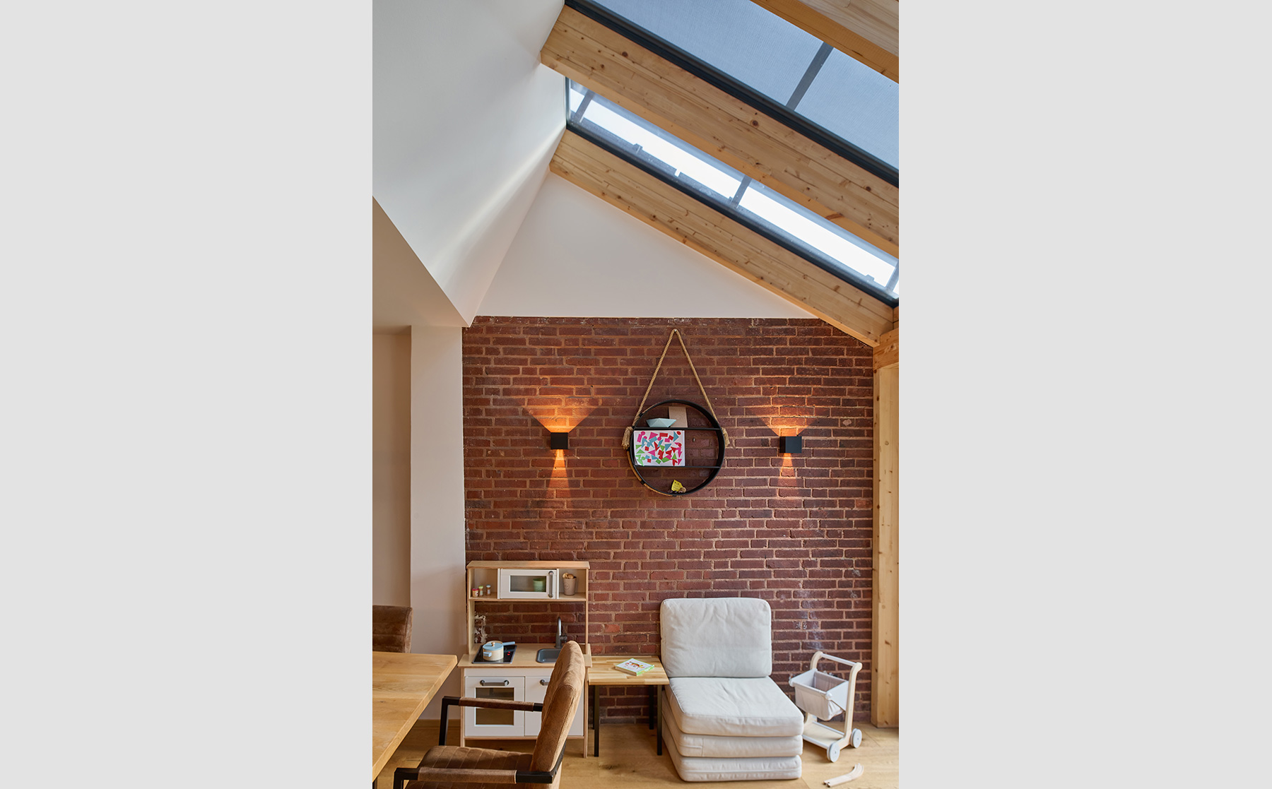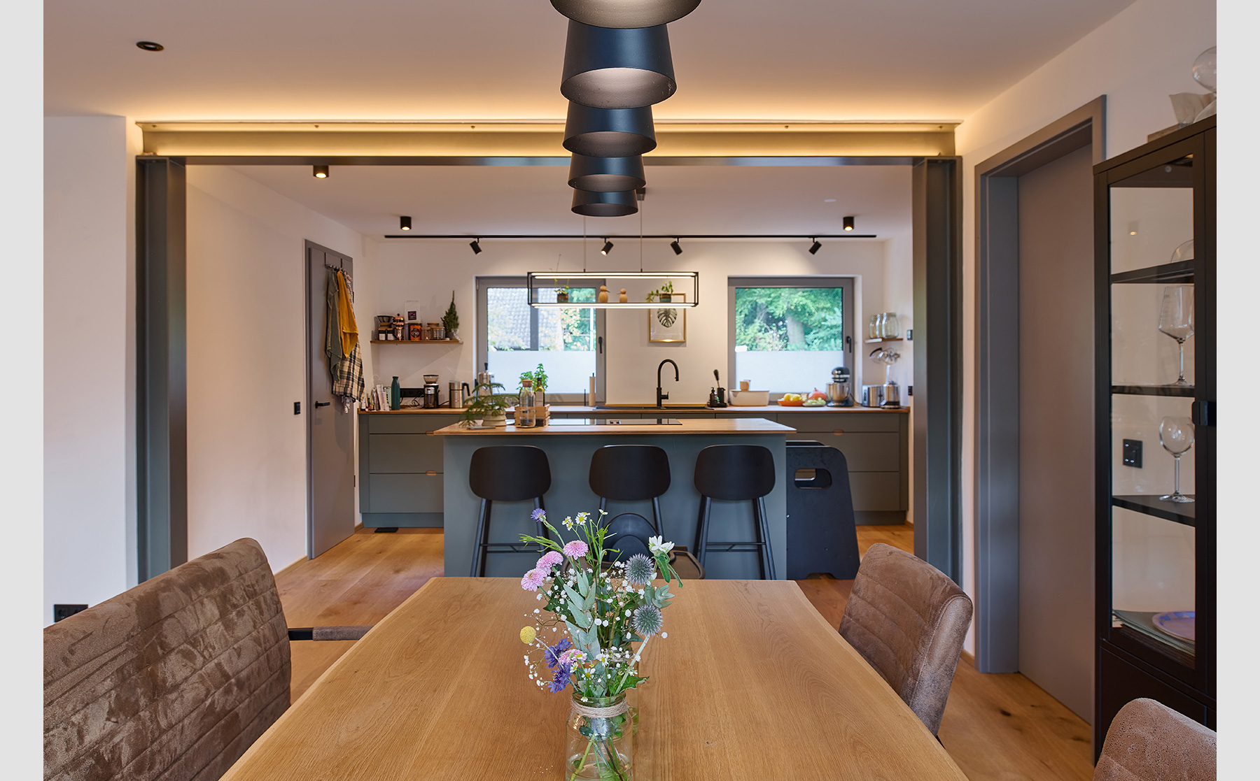 Im Erdgeschoss des Einfamilienhauses wurden die ehemals kleinteiligen Raumzuschnitte zugunsten großzügiger Raumzusammenhänge neu organisiert. Im Zentrum des Hauses ist ein offener Wohn-, Ess- und Kochbereich mit fließenden Übergängen entstanden. Der zum Garten orientierte Essbereich wurde durch eine wintergartenähnliche Erweiterung mit großflächigen Verglasungen ausgestattet, die viel Tageslicht ins Gebäudeinnere bringen und den Innenraum optisch mit dem Außenraum verbinden. Das angrenzende Schlafzimmer erhielt über eine neue Terrassentür direkten Zugang zum Garten sowie ein eigenes Ensuite-Bad. Ergänzt wird das Erdgeschoss durch einen Haustechnikraum, einen Abstellraum und einen neu errichteten, vorgelagerten Windfang mit Gäste-WC, der den Eingangsbereich funktional ordnet und architektonisch aufwertet. Eine neu gestaltete Treppe im Flur verbindet die beiden Geschossebenen. Im Dachgeschoss wurde ein freundlicher, offener Arbeits- und Spielbereich geschaffen, von dem drei weitere Zimmer sowie das Bad, ein separates WC und ein Abstellraum erschlossen werden.