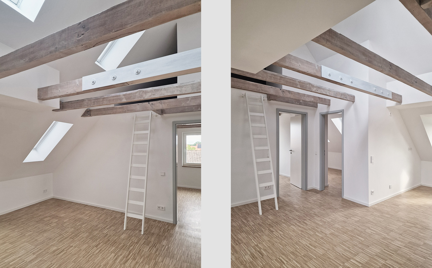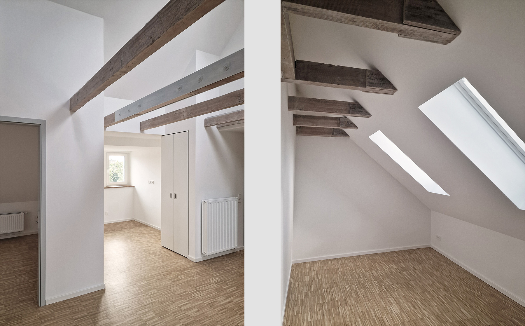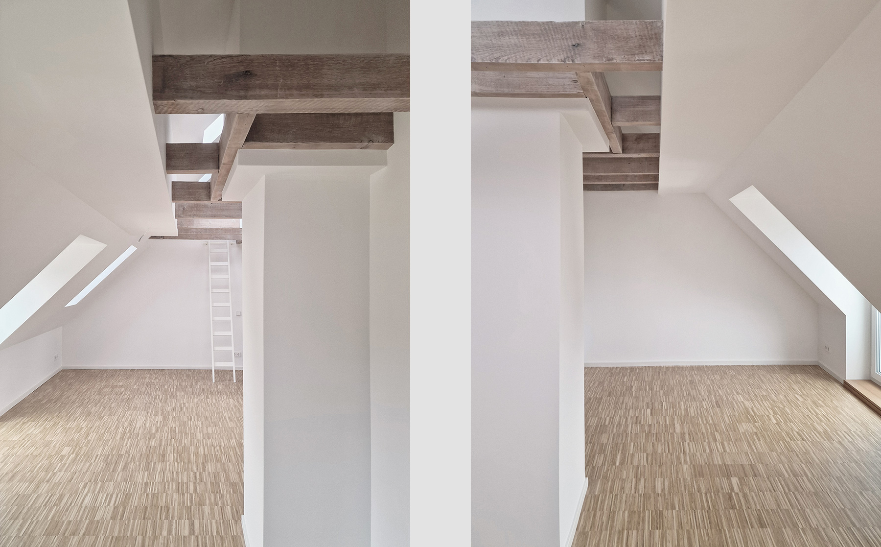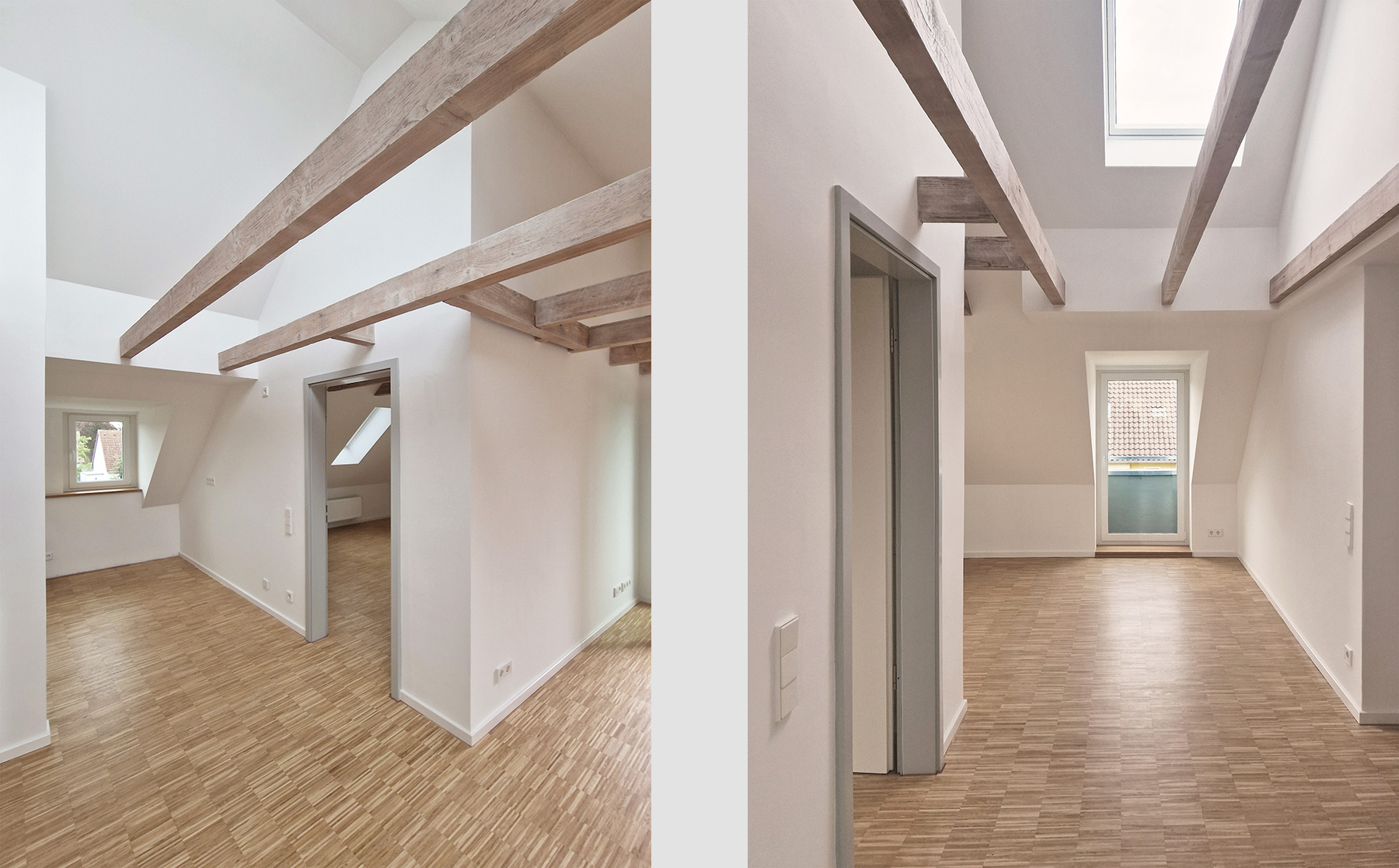 Jede der beiden Wohnungen verfügt über zwei Individualräume und ist durch ihre neue Aufteilung sehr flexibel nutzbar. Küche und Wohnbereich wurden geöffnet und über den Flur zu einem Raumgefüge verbunden. Neben dieser horizontalen Verbindung war die vertikale Öffnung der Wohnungen bis in den Spitzboden für die Raumwirkung entscheidend. Während unter der bestehenden Kehlbalkendecke und in den Gauben die Raumhöhen spürbar beschränkt sind, wird dies in anderen Bereichen durch die Aufweitung bis in den First ausgeglichen. Um das Dachtragwerk nicht zu stören, verblieben die Kehlbalken sichtbar im Raum. Die ergänzten Dachflächenfenster verbessern die Belichtung und die Großzügigkeit der Raumwirkung zusätzlich. Zudem erhielt jede Wohnung in den westseitigen Gauben bodentiefe Fenster und vorgelagerte, kleine Austritte.