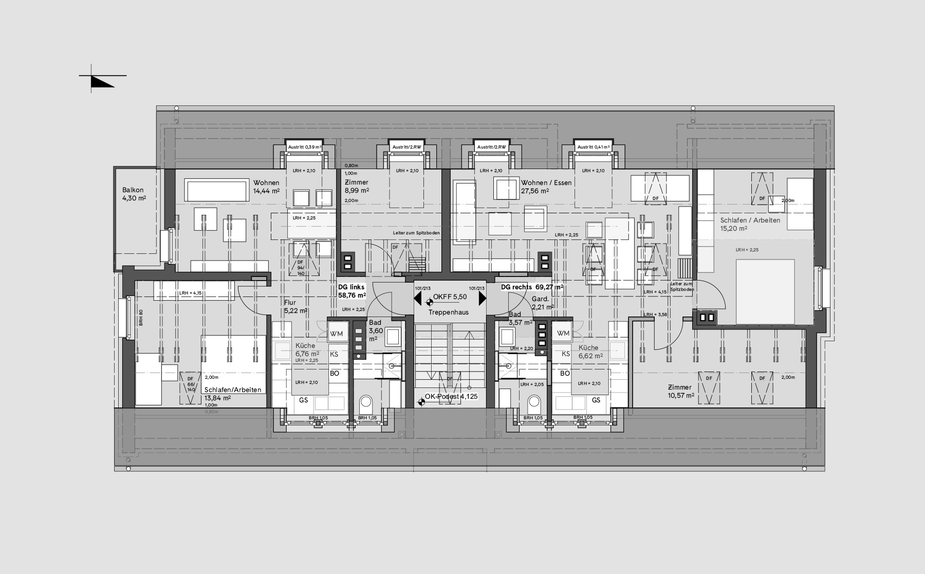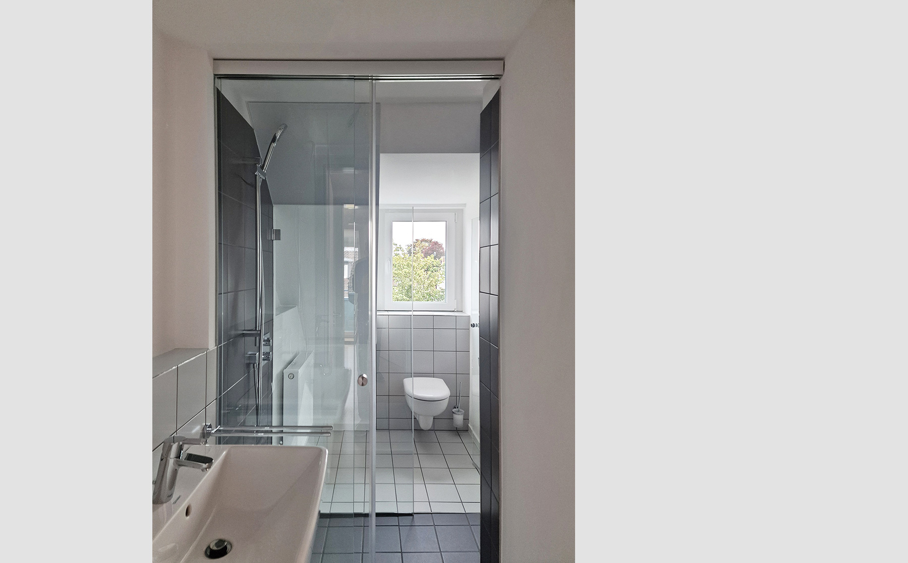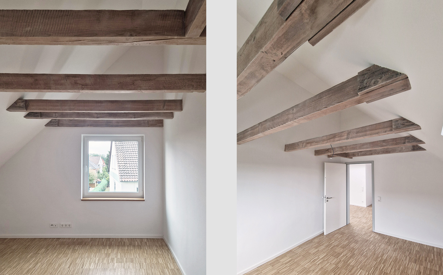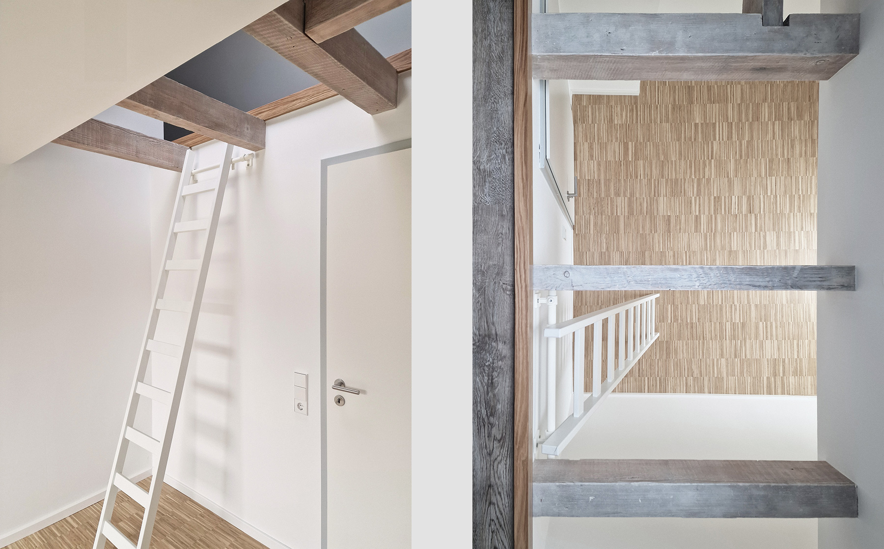 Jede der beiden Wohnungen verfügt über zwei Individualräume und ist durch ihre neue Aufteilung sehr flexibel nutzbar. Küche und Wohnbereich wurden geöffnet und über den Flur zu einem Raumgefüge verbunden. Neben dieser horizontalen Verbindung war die vertikale Öffnung der Wohnungen bis in den Spitzboden für die Raumwirkung entscheidend. Während unter der bestehenden Kehlbalkendecke und in den Gauben die Raumhöhen spürbar beschränkt sind, wird dies in anderen Bereichen durch die Aufweitung bis in den First ausgeglichen. Um das Dachtragwerk nicht zu stören, verblieben die Kehlbalken sichtbar im Raum. Die ergänzten Dachflächenfenster verbessern die Belichtung und die Großzügigkeit der Raumwirkung zusätzlich. Zudem erhielt jede Wohnung in den westseitigen Gauben bodentiefe Fenster und vorgelagerte, kleine Austritte.